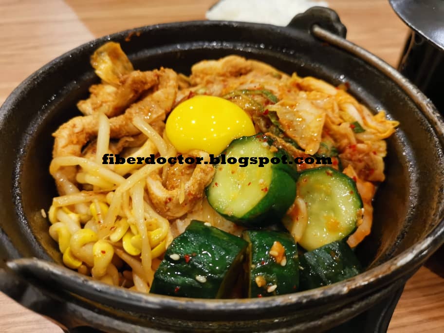 Bila sampai je hotpot ni, terkejut sebab agak besar saiz dia. Tapi outer layer hotpot je yang besar, inner layer hotpot tu tak sebesar outer layer pun. Dalam tu ada cendawan enoki, udang, abalone, lala, sotong (tak ingat lah ada ke tak) dan sayur seperti timun dan kobis/kimchi. Tapi kobis memang banyak giler. Penat jugak nak abiskan sorang. End up, tak abiskan pun kobis tu. Sup kimchi dia sedap sebab panas-panas.